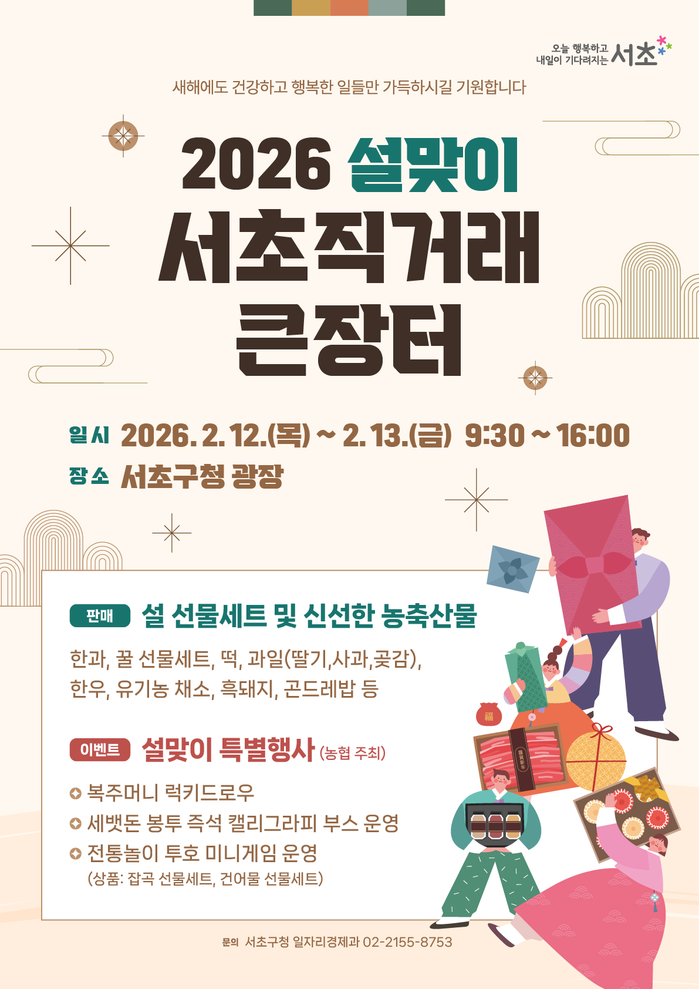 이와 함께 설맞이 장터인 만큼 이용의 재미를 더하고 가족 단위 방문객도 함께 즐길 수 있는 체험형 이벤트 부스도 운영할 예정이다. 12일 오전 11시30분부터 2시간 동안 투호 미니게임 부스, 세뱃돈 봉투 즉석 캘리그라피 부스, 복주머니 럭키드로우 부스 등이 운영되며, 지역 농협에서 후원하는 다양한 경품도 증정할 계획이다.