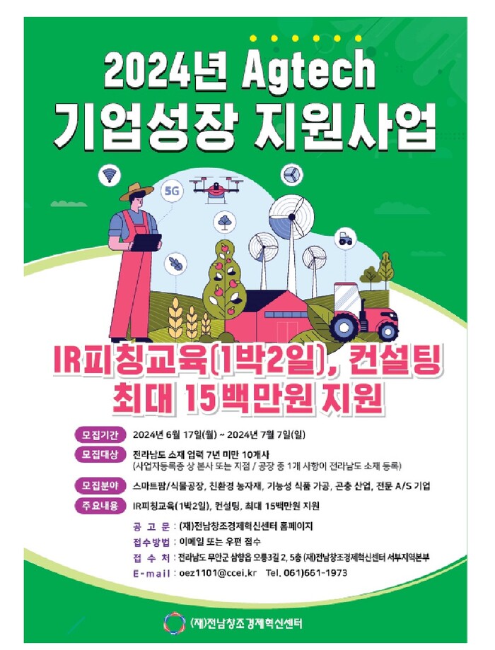 신청 대상은 공고일 기준 도내 애그테크(AgTech)분야 7년 미만 기업으로, 본사 또는 지점, 공장 중 1개 사항이 도내에 소재해야 한다.