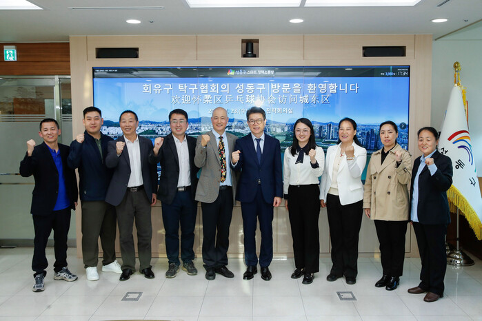 서울 성동구가 최근 국외 자매도시인 중국 회유구의 탁구협회를 2박3일간 초청해 양 도시 탁구협회 간 친선경기 및 문화교류 행사를 성공적으로 개최했다. 사진은 정원오 구청장(오른쪽 네 번째)이 회유구 탁구협회 관계자들과 기념 촬영을 하는 모습. (사진=성동구청 제공)