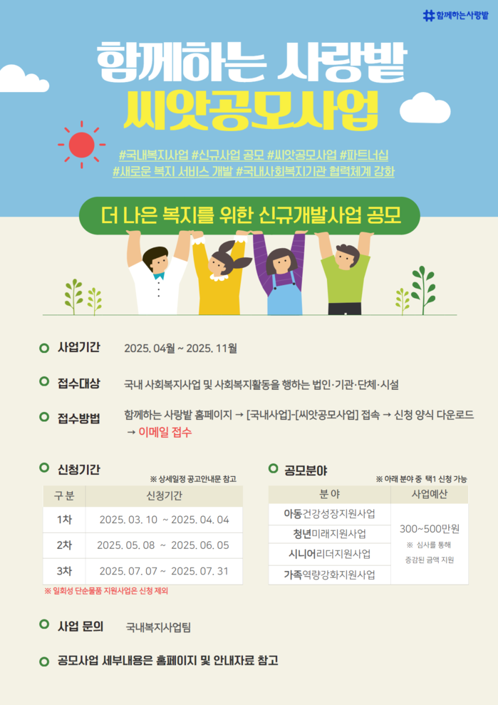 사단법인 함께하는 사랑밭(대표이사 정유진)은 지난 10일부터 4월 4일까지 2025년 함께하는 사랑밭 '씨앗공모사업' 접수가 자사홈페이지를 통해 진행된다고 밝혔다.