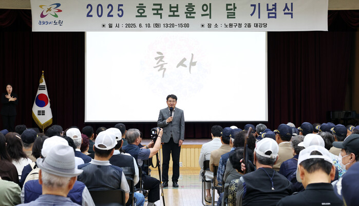 오승록 노원구청장이 지난 10일 구청 대강당에서 열린 ‘2025년 호국보훈의 달 기념식’에 참석해 국가유공자와 보훈 가족들에게 감사의 마음을 전했다. 사진은 오 구청장이 인사말을 하는 모습. (사진=노원구청 제공)