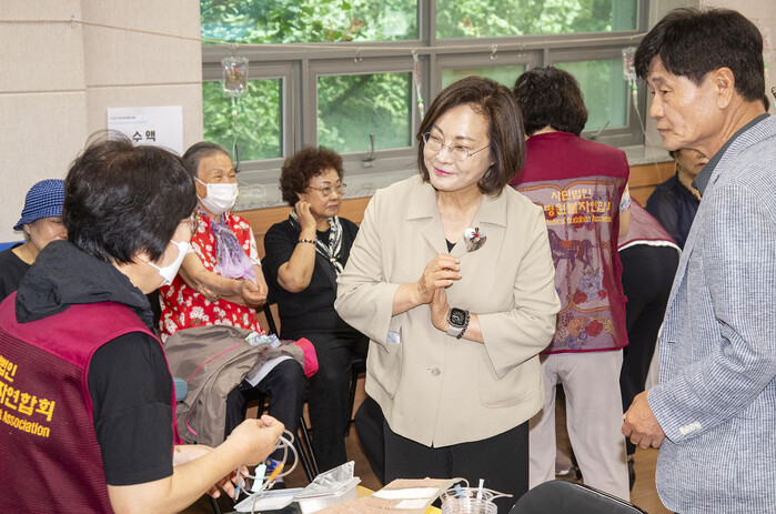 박희영 서울 용산구청장은 지난 14일 대한노인회 용산구지회 강당에서 열린 ‘노인 대상 무료진료 의료봉사’ 현장을 찾았다. 이날 행사는 의료 취약계층인 노인들의 건강을 돌보기 위한 취지로 마련됐다. 사진은 박희영 구청장이 ‘노인 대상 무료진료 의료봉사’ 현장에서 노인들과 소통하고 있는 모습. (사진= 용산구청 제공)