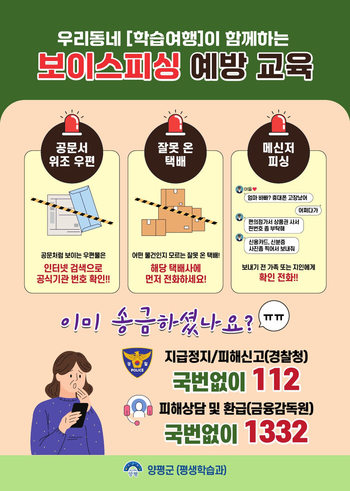한편, 보이스피싱 예방교육은 마을 단위로 신청이 가능하며, 참여를 희망하는 마을은 양평군 평생학습과 평생학습팀으로 문의하면 된다.