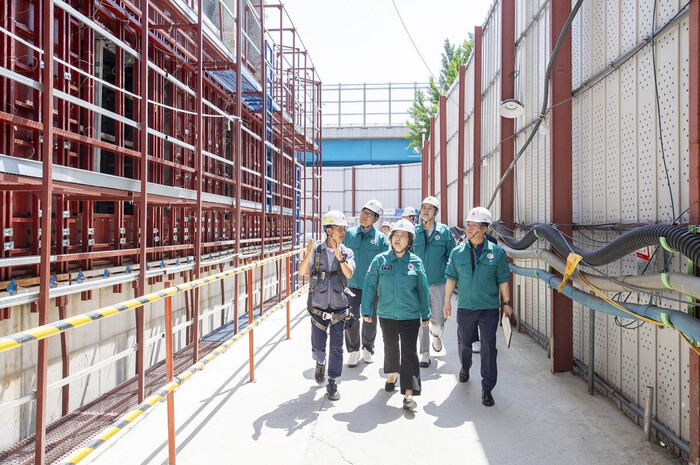 박희영 서울 용산구청장은 최근 이촌 현대아파트(이촌동 301-160 일대)와 중산시범아파트(이촌동 211-2)를 방문해 현장 안전점검을 실시했다. 사진은 박희영 구청장(가운데)과 관계자들이 이촌 현대아파트 리모델링 공사장을 방문해 현장 안전점검을 하는 모습. (사진=용산구청 제공)