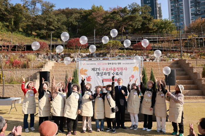 서울 구로구가 최근 온수근린공원 문학지구에서 ‘제3기 마을정원사 양성과정’ 수료식을 개최했다. 이번 수료식은 정원문화를 생활 속으로 확산하고 지역의 녹색환경을 주민이 함께 가꿔 나가기 위해 마련됐다. 사진은 수료식에서 희망의 씨앗 풍선 날리기가 진행하는 모습. (사진=구로구청 제공)