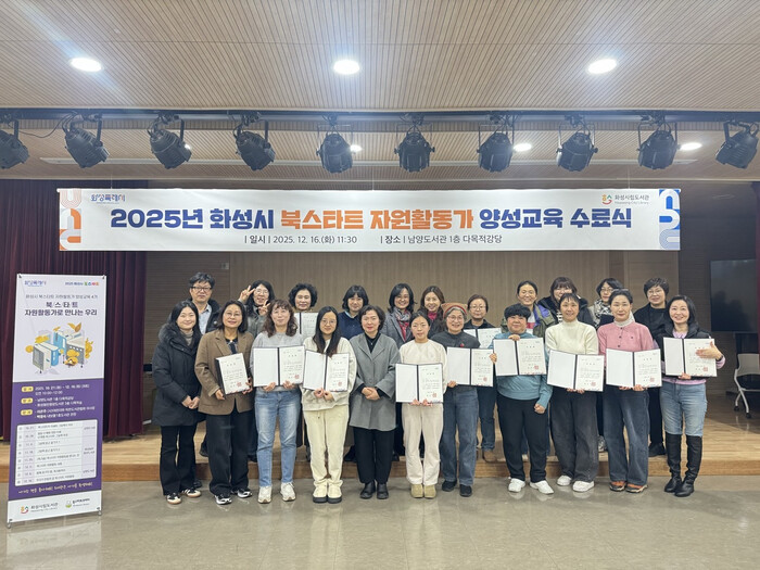 윤미영 도서관정책과장은 “영유아 시기부터 책과 함께 성장할 수 있도록 돕는 북스타트 활동은 화성시 지역의 큰 울림을 주고 있다”며 “이번 수료식을 통해 새로운 자원활동가들이 화성시립도서관과 함께 독서문화 확산의 든든한 동반자가 되어주길 기대한다”고 말했다.