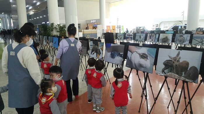 | ▲ 광주광역시 관내 어린이집 원아들과 관계자들이 시보건환경연구원 야생동물구조센터가 지난 3월 말 광주시청 1층 시민홀에서 전시한 구조 야생동물들의 사진을 관람하고 있다. / 광주광역시 제공 |