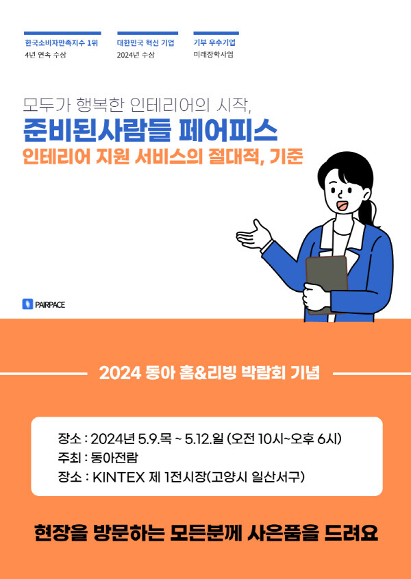 페어피스는 ‘모두가 행복한 인테리어의 시작’이라는 슬로건을 기반으로, 인테리어에 집중하는 것으로부터 시작할 수 있도록 입주민동의서, 승강기보양, 행위허가 등 지원서비스를 제공하는 기업이다.