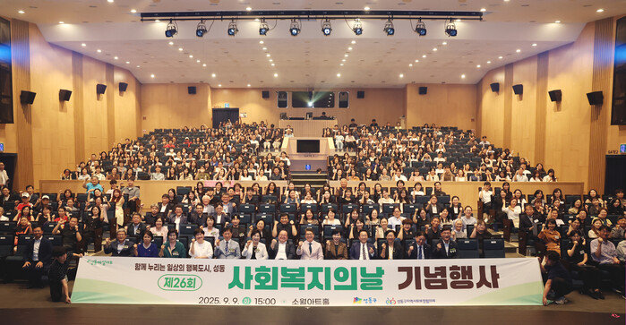 서울 성동구가 지난 9일 소월아트홀에서 ‘제26회 사회복지의 날’ 기념행사를 개최했다. 행사에는 정원오 구청장을 비롯해 350여명의 민·관 사회복지 종사자와 동 지역사회보장협의체 위원이 참여했다. 사진은 정 구청장(앞줄 가운데)이 참석자들과 기념 촬영을 하는 모습. (사진=성동구청 제공)
