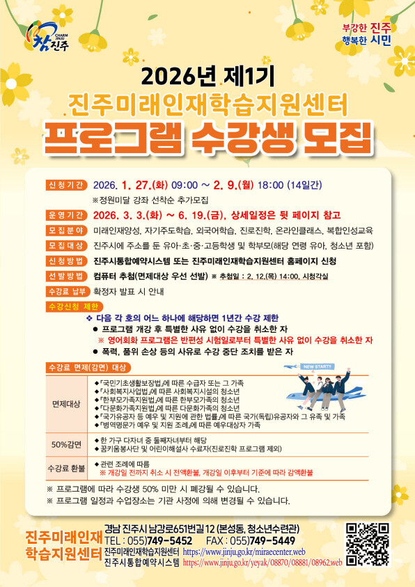 한편, 저소득층 자녀의 교육지원을 확대하기 위해 저소득 가정의 자녀는 수강료를 면제하고 우선 선발하며, 다자녀 가정의 둘째 자녀부터는 수강료의 50%를 감면한다. 프로그램별 운영 일정이나 수강료, 감면 대상 등 자세한 사항은 진주미래인재학습지원센터 누리집에서 확인하거나 진주미래인재학습지원센터로 문의하면 된다.