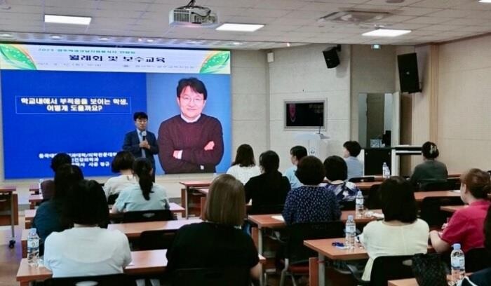 사공정규 동국의대 정신건강의학과 교수가 12일 경상북도경주교육지원청 3층 대강당에서 개최된 경상북도경주교육지원청이 주최하는 ‘2023학년도 경주학생상담자원봉사자연합회 보수교육’에서 강연하고 있다. <사진=경상북도경주교육지원청 제공>