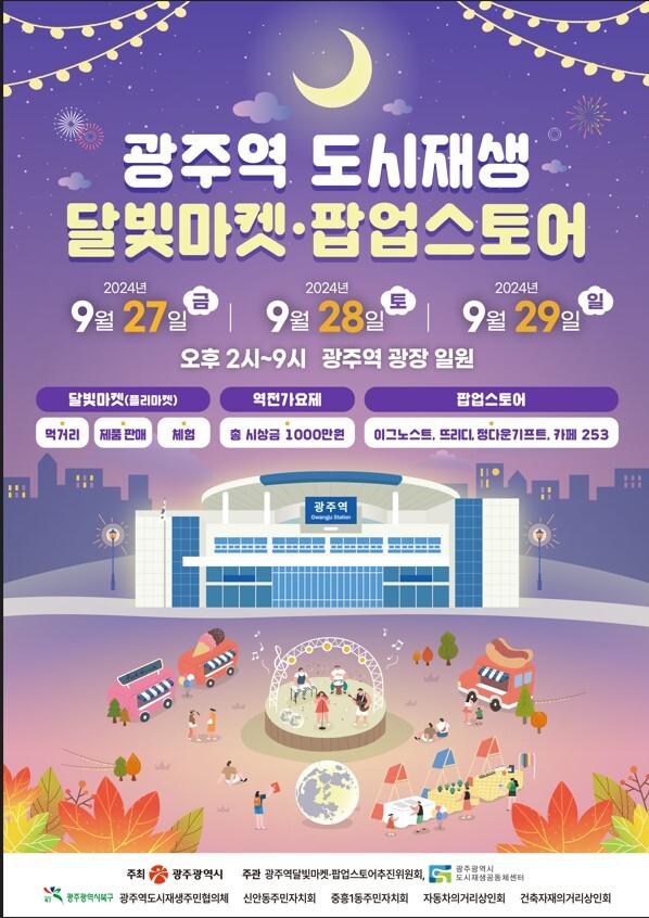 행사는 ‘달빛플리마켓’, ‘팝업스토어’, ‘통기타·시낭송·라인댄스 등 지역주민 공연 프로그램’, ‘포크·밴드·트로트 페스타 등 테마 공연’, ‘역전가요제’, ‘먹거리 트럭’, ‘광주역 사진전’, ‘도시재생 홍보 및 세미나’, ‘아로마 향수 체험’ 등 광주시민 누구나 참여할 수 있도록 구성했다.
