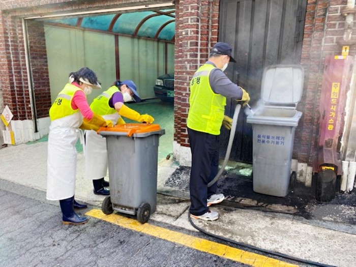 | ▲ 음식점 대상 음식물류 폐기물 전용 수거용기 방문 소독 작업 모습. (사진제공=성동구청) |