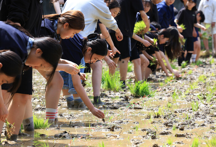 서울 노원구가 최근 노원구 마들근린공원 내 벼농사 체험장에서 ‘2025년 마들농요와 함께하는 모내기 체험행사‘를 개최했다. 사진은 행사에서 수락중학교 학생 및 주민들이 모심기 체험을 하는 모습. (사진=노원구청 제공)
