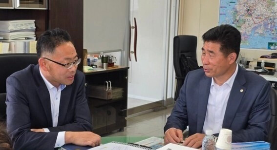 | ▲ 오민수 함평군사회단체협의회장(사진 오른쪽)과 윤진호 전라남도 기획조정실장이 면담 모습.(출처=함평사회단체협의회) |