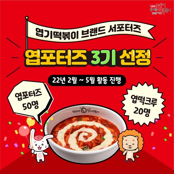 엽기떡볶이 가맹본부 핫시즈너는 지난 3일 서포터즈 모집을 시작하여 약 2주간 공개 모집을 진행했으며, 24일 총 70인의 크리에이터로 활동할 ‘엽포터즈’와 ‘엽떡크루’를 선발했다.
