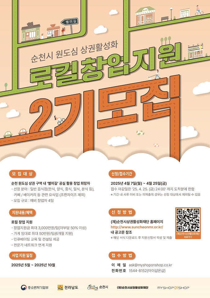 시 관계자는 “원도심 로컬 창업 지원사업은 실질적인 창업으로 이어질 수 있도록 창업지원금을 비롯하여 창업 전과정을 촘촘히 지원하는 것이 강점”이라며 “열정과 아이디어를 가진 예비 창업자들이 순천 원도심에 새로운 활력을 불어넣는 주역이 되기를 기대한다”고 말했다.