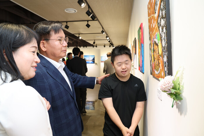 박강수 서울 마포구청장은 마포구 대흥로24바길 11에 위치한 소금길갤러리를 방문해 '장애예술전시 페스티벌' 에 참석했다. 사진은 전시에 참가한 박강수 구청장이 전시를 둘러보는 모습. (사진=마포구청 제공)