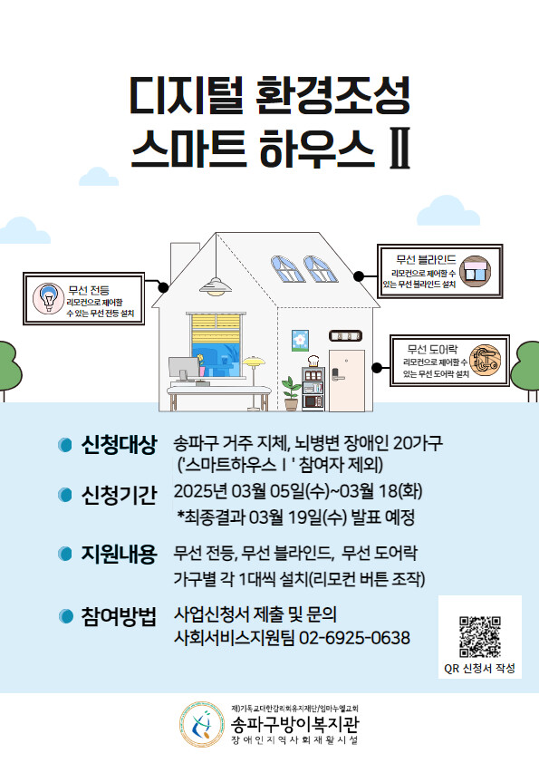 디지털환경조성 ‘스마트 하우스Ⅱ’ 사업은 송파구 내 지체·뇌병변 장애인 20명을 대상으로, 각 가정에 무선 전등, 무선 블라인드, 무선 도어락과 같은 디지털 기기를 설치하여 물리적인 부담을 줄여 주거 편의성을 높이는 환경을 조성한다. 특히, 이 사업은 장애 특성에 맞춘 무선 장비 기술 적용으로 생활의 불편함을 최소화하고 장애인의 자율적인 생활을 지원하는 데 중점을 둔다.