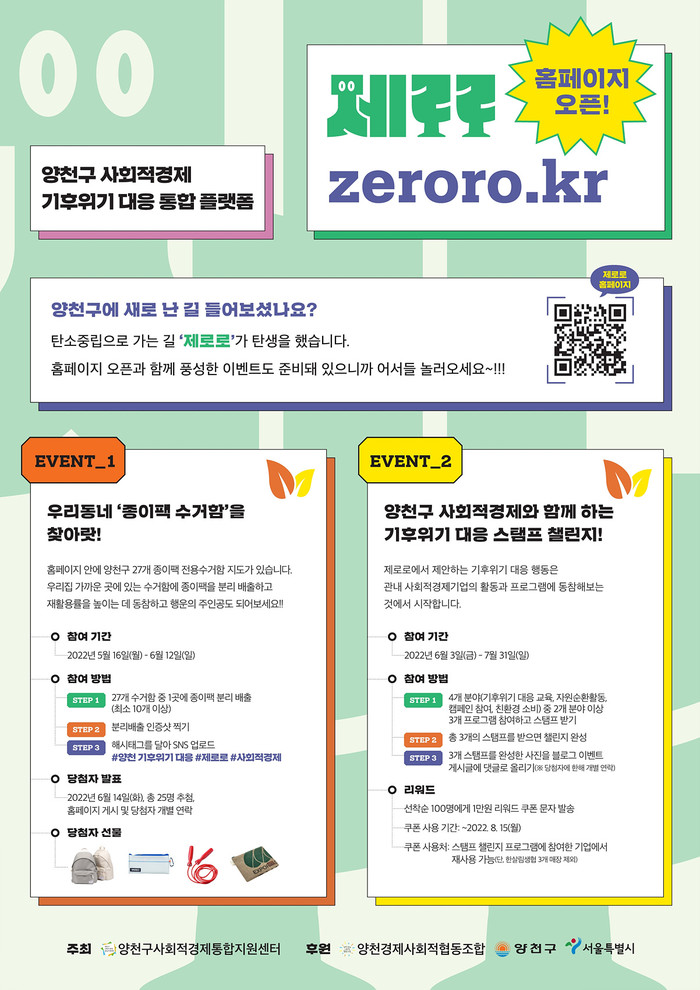 이벤트 참여를 원하는 주민은 '제로로' 홈페이지에 접속해 관련 정보를 확인하면 되고, 기타 문의 사항은 양천구사회적경제통합지원센터로 문의하면 된다.
