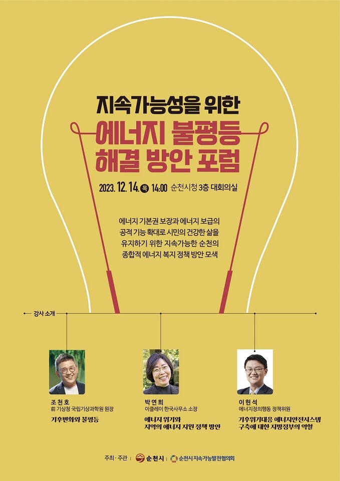 ▲기후변화와 불평등(조천호 전 기상청 국립기상과학원장) ▲에너지 위기와 지역의 에너지 지원 정책 방안(이헌석 에너지정의행동 정책위원) ▲기후위기대응 에너지안전시스템 구축에 대한 지방정부의 역할(박연희 이클레이한국사무소 소장)에 대해 발표하고, 송경환 순천시 지속가능발전협의회 상임의장을 좌장으로 종합토론을 진행할 계획이다.