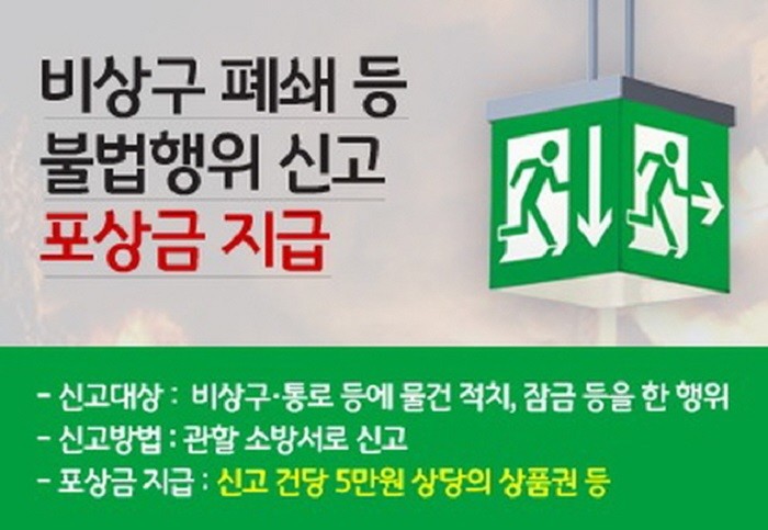 | ▲ 비상구 폐쇄 등 불법행위 신고 포상금 지급 홍보 이미지 / 해남소방서 제공 |