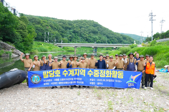 (사)대한민국 특전사동지회 경기광주지회가 최근 곤지암천 일대에서 ‘클린데이’ 환경정화 활동을 진행했다. 이날 행사는 방세환 시장도 직접 현장을 찾아 환경정화 참여했다. 사진은 방 시장이 봉사자들과 기념 촬영을 하는 모습. (사진=광주시청 제공)