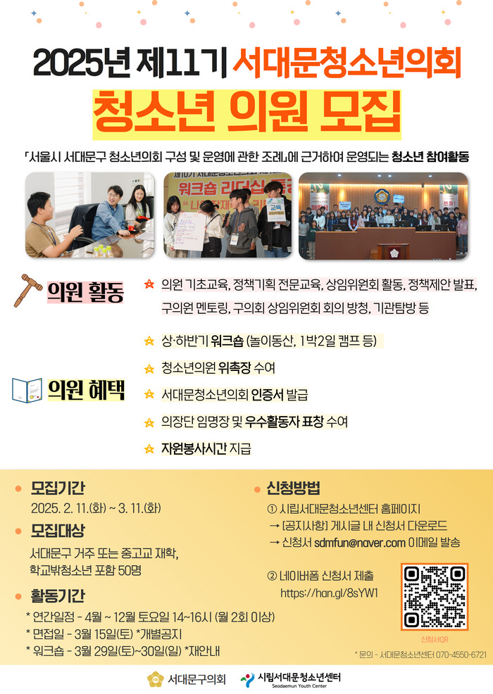 지원을 원하는 청소년들은 시립서대문청소년센터 홈페이지에 게시한 신청서를 이메일(sdmfun@naver.com)로 제출하면 된다. 그밖에 서대문청소년의회에 대한 내용은 서대문청소년센터 청소년활동팀을 통해 상세히 안내받을 수 있다.