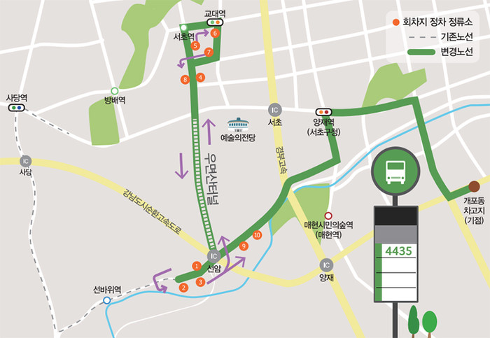 3일 구에 따르면 4435번 버스는 21일부터 ‘개포동~양재역~우면동~우면산터널~서초역·교대역’ 노선으로 양방향 운행한다. 첫차와 막차 시간은 각각 오전 4시20분, 오후 11시30분이다.