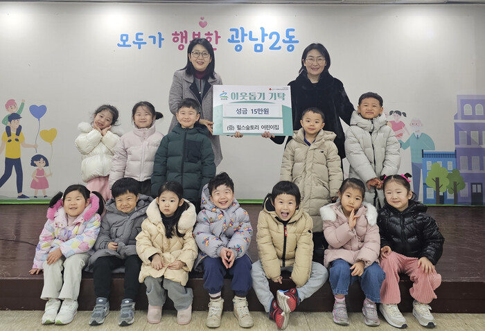 경기 광주시 태전동에 위치한 힐스숲토리 어린이집이 최근 겨울간식 행사에서 마련한 수익금 15만원을 광남2동 행정복지센터에 기부했다. 사진은 기탁식에서 어린이집 원생들과 관계자들이 기념 촬영을 하는 모습. (사진=광주시청 제공)