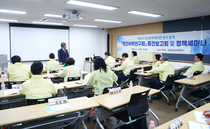 이강무 회장은 인사말에서 “오늘 많은 의원님들께서 깊은 관심을 가지고 계시는 민간위탁 연구용역 중간보고회에서 다양한 의견제시와 질문들이 있을 것이다. 의원님들의 고견이 연구에 적극 반영되어 송파구에 도움이 되는 연구 결과를 만들어 낼 수 있도록 노력하겠다”고 말했다.