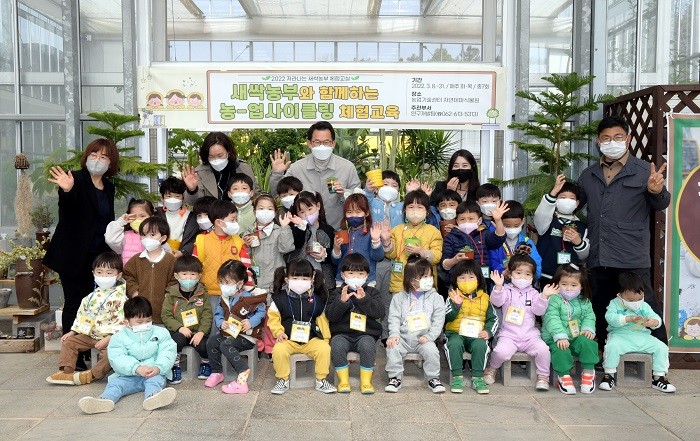 | ▲ 문영훈 광주광역시 행정부시장(맨 뒷줄 가운데)이 24일 오전 농업기술센터를 방문해 자연테마식물원 및 힐링농업 체험학습장에서 진행된 새싹농부 체험 프로그램에 참여한 후 기념촬영을 하고 있다./광주광역시 제공 |