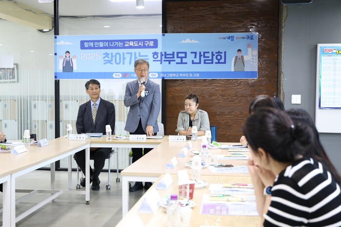 서울 구로구가 지난 10일 구일고등학교를 시작으로 ‘찾아가는 학부모 간담회’의 첫발을 내디뎠다. 간담회는 학부모와 교원 등 교육 주체의 목소리를 가까이에서 듣기 위해 마련된 자리로, 이달부터 11월까지 지역내 희망 초·중·고교를 대상으로 순차적으로 진행된다. 사진은 장인홍 구청장이 인사말을 하는 모습. (사진=구로구청 제공)