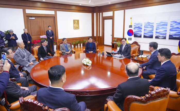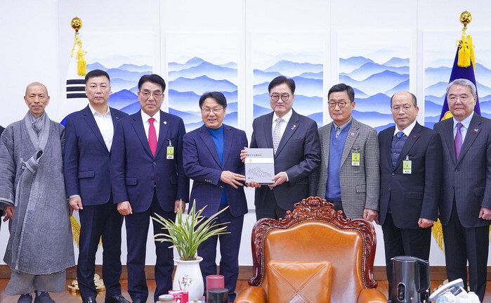 | ▲ 강기정 광주광역시장(사진 가운데)이 5·18 단체, 종교계, 시민단체 대표 등과 지난 17일 오전 국회 우원식 국회의장을 예방 한 후 면담하고 있다./광주광역시 제공 |