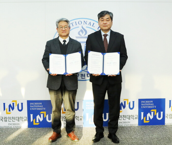 | 이경용 인천공항에너지(주) 사장[왼쪽]과 이인재 인천대 총장[오른쪽]이 포즈를 취하고 있다. [사진=인천대] |
