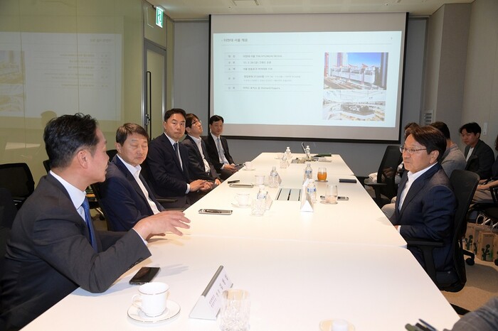| ▲ 강기정 광주광역시장이 14일 오후 광주 복합쇼핑몰 추진 전략 협의를 위해 여의도 ‘더현대 서울’을 방문해 관계자로부터 현황을 청취하고 있다. /광주광역시 제공 |