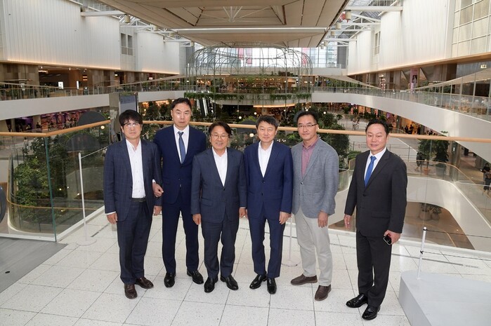 | ▲ 강기정 광주광역시장은 14일 오후 광주 복합쇼핑몰 추진 전략 협의를 위해 서울 여의도 '더현대 서울'을 찾았다. 사진 왼쪽부터 현대백화점 민왕일 경영지원본부장, 정지영 대표이사, 강기정 광주광역시장, 현대지에프홀딩스 장호진 대표이사, 김준영 광주시 신활력추진본부장, 현대백화점 김창섭 영업본부장. / 광주광역시 제공 |