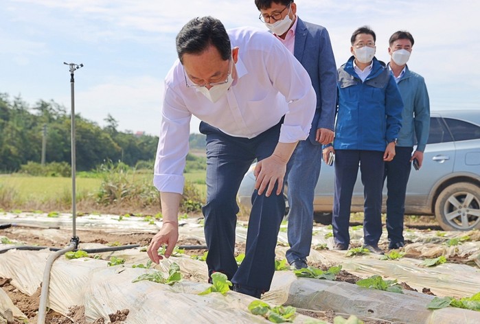 | ▲ 태풍 '힌남노'가 지나간 배추재배 농지를 방문하 명현관 해남군수가 배추 생육상태를 점검하고 있다. / 해남군 제공 |