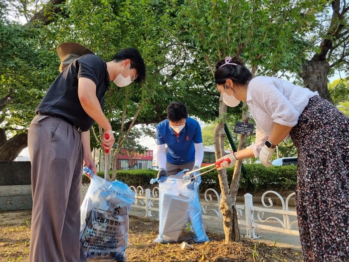 | ▲ 해남군 공직자들이 7일 읍 시가지에서 태풍 및 무단 투기된 쓰레기를 수거하고 있다. / 해남군 제공 |