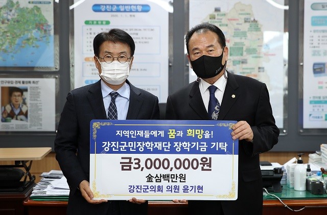 윤기현 위원장은 2008년에 1천만 원의 장학금을 재단에 전달한 것을 시작으로 제6대 강진군의회 의원으로 당선된 2011년부터 매월 2만 원씩을 정기적으로 기탁하는 등 지금까지 2,090만 원을 기부했다.