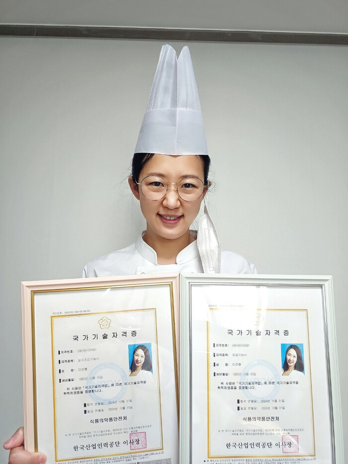 일식은 실기 합격률이 20~30%, 제과 실기 합격률은 30~40%, 서울 휘경동 국가자격시험장과 남부시험장에서 치뤘다. 두 과목 시험 준비는 짜릿하고 즐거우면서도 무리가 있었다. 과정에서 많은 사연이 있었기에 벅차오르고 기쁘다”라며 소감을 전했다.