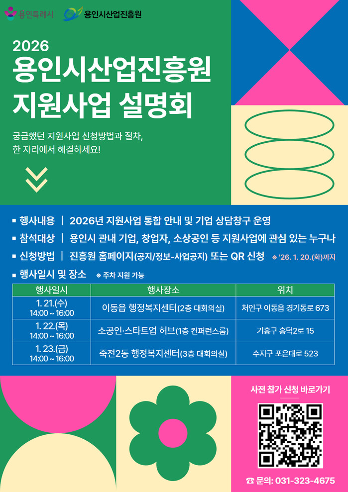 또한, 진흥원은 기업들의 접근성을 높이기 위한 3개구 순회 ‘찾아가는 설명회’도 함께 진행한다. 오는 21일 처인구(이동읍 행정복지센터)를 시작으로 22일 기흥구(소공인·스타트업 허브), 23일 수지구(죽전2동 행정복지센터)에서 각각 오후 2시에 개최된다. 현장에서는 올해 지원사업 브리핑과 더불어 1:1 상담 창구가 운영될 예정이다.