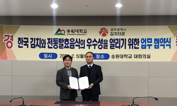 [광주=정찬남 기자] 광주광역시김치타운관리사무소와 송원대학교 산학협력단·대학 혁신사업단은 5일 송원대학교에서 ‘발효음식 상호지원 및 공동성과 창출을 위한 업무협약’을 체결했다.