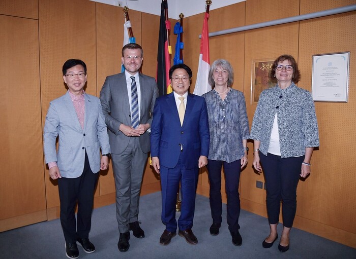 | ▲ 강기정 광주광역시장과 광주시대표단이 25일(현지시간) 오전 독일 뉘른베르크 시청을 방문, 마르쿠스 쾨니히 뉘른베르크 시장과 만나 인권도시 활성화 방안 등을 논의한 뒤 기념촬영을 하고 있다. 왼쪽부터 박병규 광산구청장, 마르쿠스 쾨니히 시장, 강기정 광주시장, 크리스틴 슈슬러 국제교류국장, 마티나 미튼후버 인권국장./광주광역시 제공 |