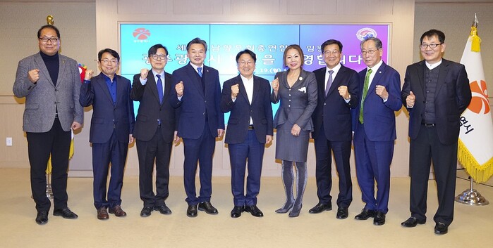 [광주=정찬남 기자] 강기정 광주광역시장이 19일 오후 시청 비즈니스룸에서 세계호남향우회총연합회 회장단과 면담을 갖고 2024 세계호남인의 날 행사 추진계획 및 협력방안을 논의한 뒤 기념촬영을 하고 있다./광주광역시 제공