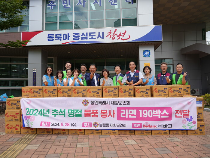 봉림동 재향군인회(회장 김재곤)가 주최하고 새마산 로타리클럽(회장 산호 강동화)과 주식회사 마크(대표 현창모)가 후원하는 '2024년 추석 명절 물품 봉사 라면 190박스 전달식'이 봉림동행정복지센터에서 진행됐다고 밝혔다.