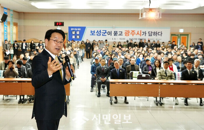 | ▲ 강기정 광주광역시장이 9일 보성군청 대회의실에서 열린 '광주·전남 통합 보성군 상생토크'에 참석해 통합 이후 보성 발전 방향을 군민들과 공유하고 있다. /광주광역시 제공 |