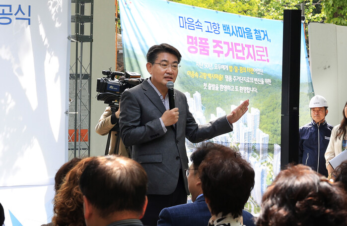 오승록 서울 노원구청장이 8일 백사마을에 위치한 중계로지하차도 인근에서 ‘백사마을 건축물 해체 착공식’에 참석했다. 사진은 오 구청장이 착공식에서 인사말하는 모습. (사진=노원구청 제공)