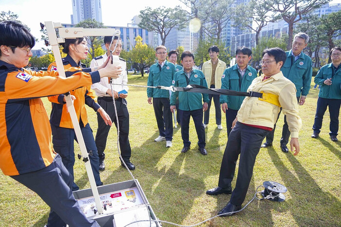 | ▲ 강기정 광주광역시장이 31일 오후 시청에서 진행된 화재대비 민방위 대피훈련에 참여해 시청 야외 잔디광장에서 완강기 사용법을 체험하고 있다./광주광역시 제공 |