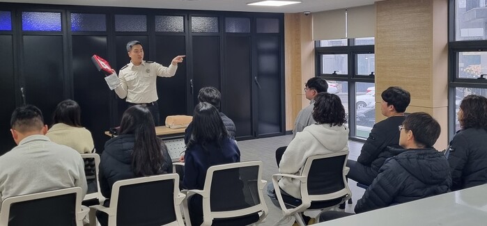 | ▲ 주영민 해남소방서 소방장이 18일 오전 해남읍 소재 로컬푸드직매장 2층 대회의실에서 관내 심폐소생에 필요한 AED(자동심장층격기)설치 장소 관계인 및 군민 등을 대상으로 심폐소생술 교육을 진행하고 있다. / 해남소방서 제공 |